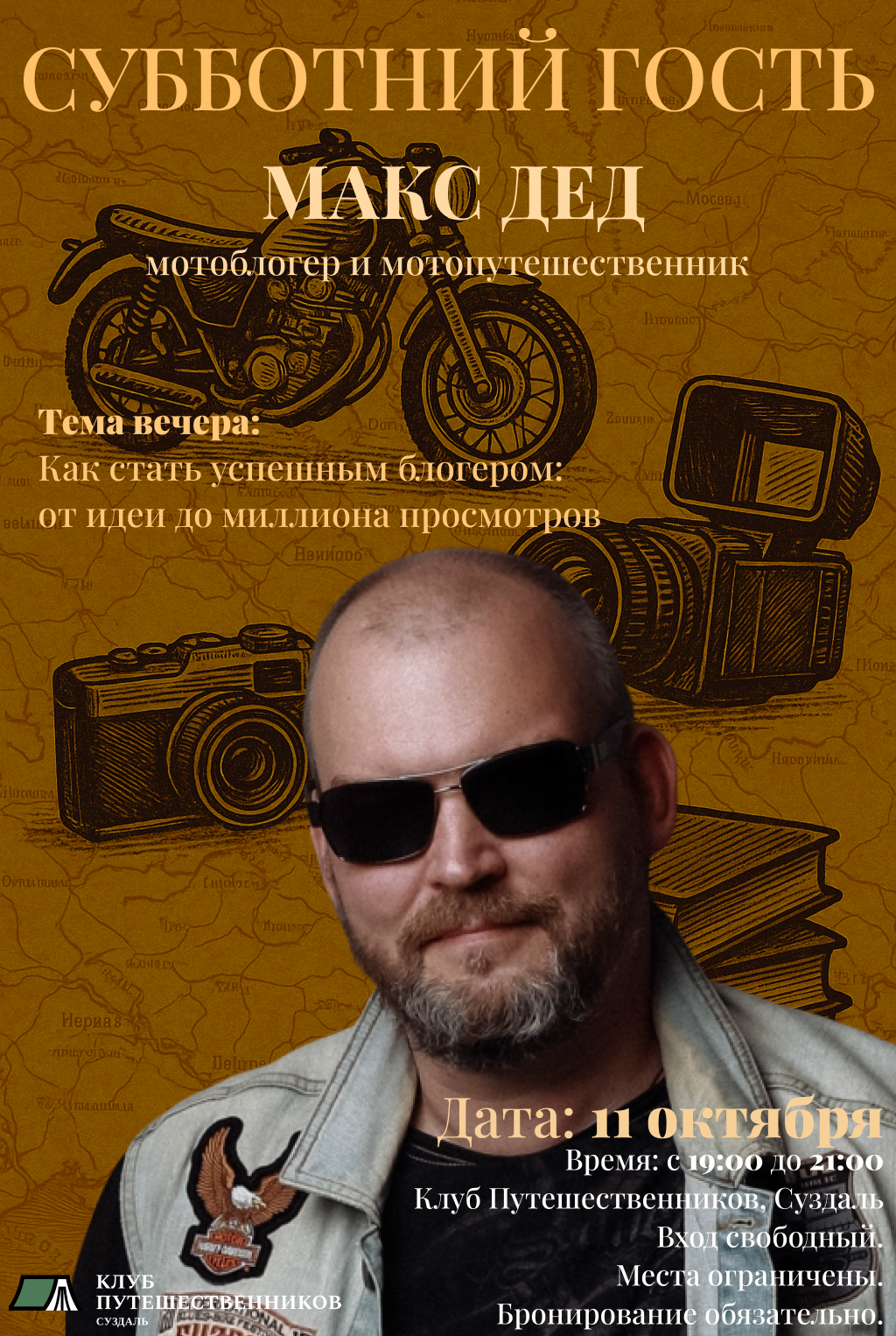 11 октября в Клубе Путешественников мы встретимся с человеком, которого знают тысячи подписчиков и зрителей YouTube. Макс Дед — мотоблогер и мотопутешественник, для которого дорога стала не только маршрутом, но и способом общения с целым сообществом. Его ролики собирают миллионы просмотров, а его имя давно стало синонимом живого, честного разговора о мотоциклах, путешествиях и свободе.